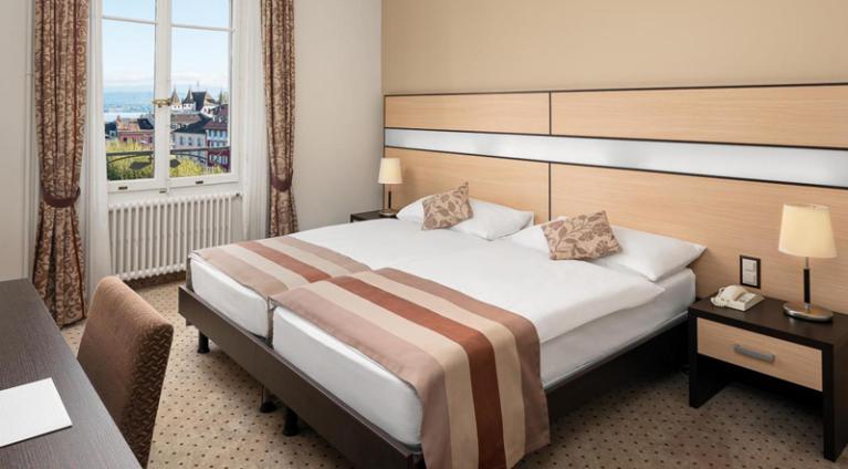 53 Hotelzimmer, von der Standard-Einrichtung bis zur Junior-Suite, stehen auf 4 Etagen (Lift) zu Ihrer Verfügung. In einigen Zimmern haben Sie freie Sicht auf den See und die Alpen.